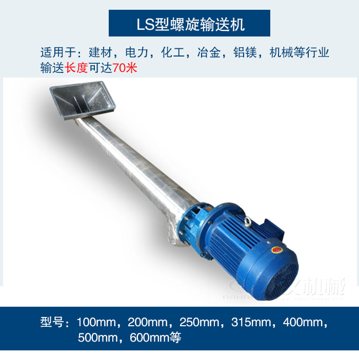 型號:LS型螺旋輸送機以管徑為型號:100mm,200mm,250mm,315mm,400mm,500mm,600mm等型號。