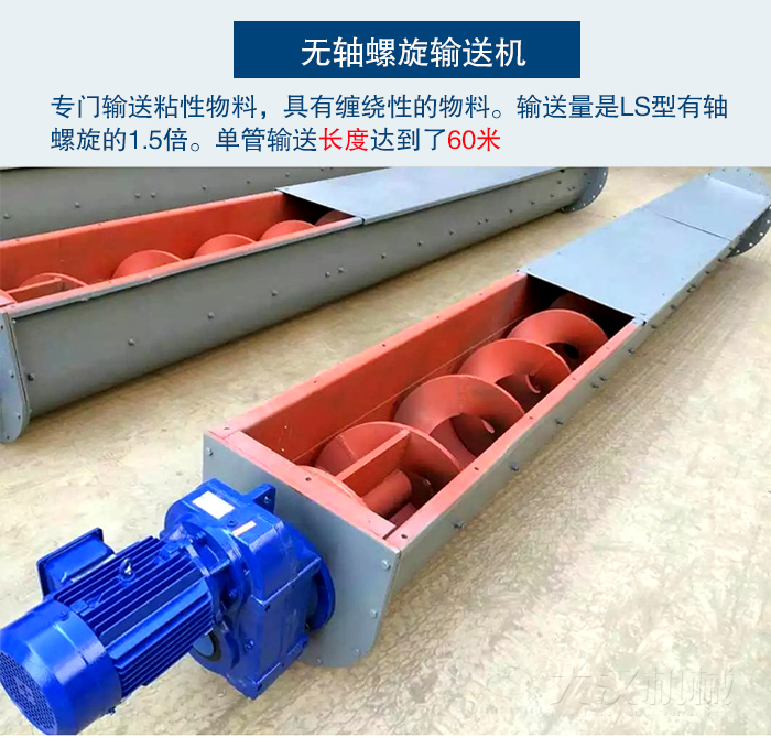 無軸螺旋輸送機又是,在LS型螺旋輸送機的基礎上進行改進的。由于LS型螺旋輸送機結構所以無法輸送一些,有粘性和纏繞性的物料。所以就出現了無軸螺旋輸送機。因此無軸螺旋輸送機就成為了專門輸送一些,粘性物料,具有纏繞性的物料。無軸螺旋輸送機不僅在物料上有所突破,在輸送量上也超過了LS型有軸螺旋的1.5倍。并且單管輸送長度達到了60米的輸送距離。