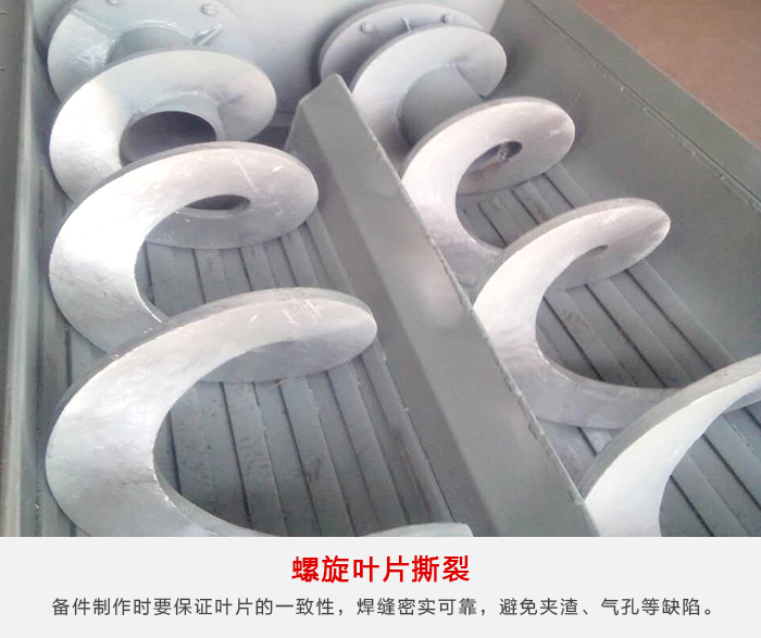 1、由于原料中異物等可造成螺旋葉片損壞,嚴重時螺旋葉片與螺旋軸焊接處脫焊,形成螺旋葉片撕裂,螺旋葉片損壞需提高備件質量和強度,在備件制作時要保證葉片的一致性,焊縫密實可靠,避免夾渣、氣孔等缺陷,保證焊接質量,同時提高螺旋軸及傳動軸的強度。