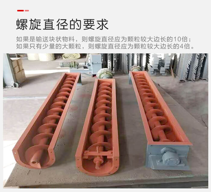 5.螺旋直徑對于絞龍輸送機的螺旋直徑來講,應(yīng)滿足的要求有:如果是輸送塊狀物料,則螺旋直徑應(yīng)為顆粒較大邊長的10倍;如果只有少量的大顆粒,則螺旋直徑應(yīng)為顆粒較大邊長的4倍。