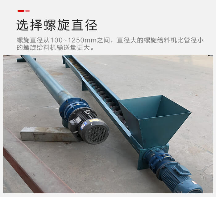 螺旋給料機(jī)螺旋直徑從100~1250mm之間,選擇不同的管徑對于單位時(shí)間輸送量是有直接的影響的,直徑大的螺旋給料機(jī)比管徑小的螺旋給料機(jī)輸送量更大。