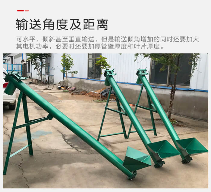 螺旋給料機(jī)可以水平、傾斜甚至垂直輸送,但是輸送傾角增加的同時(shí)還要加大其電機(jī)功率,必要時(shí)還要加厚管壁厚度和葉片厚度。