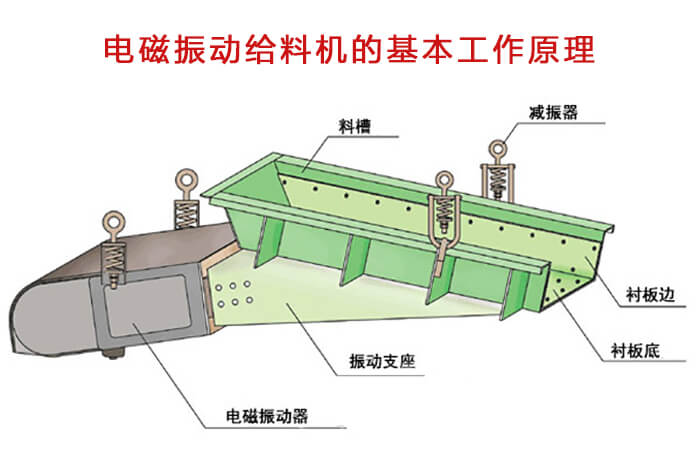 電磁振動給料機是一個較為完整的雙質點定向強迫振動的彈性系統, 整個系統工作在低臨界共振狀態,主要利用電磁激振器驅動槽體以一定的傾角做往復振動,使物料沿槽移動。為電磁振動給料機的工作原理。