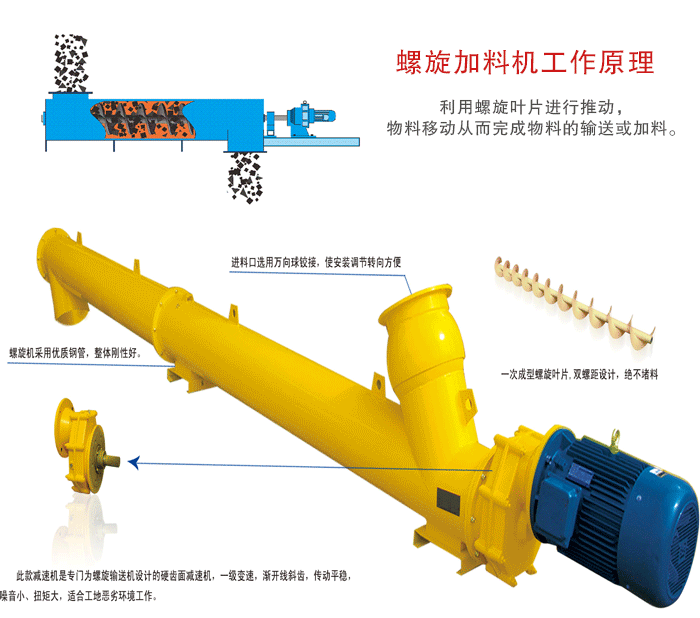 螺旋加料機(jī)主要的輸送角度為傾斜0°到45°之間大于45°就不能完成自由調(diào)整角度的功能,主要的輸送原理是利用螺旋葉片進(jìn)行推動(dòng),物料移動(dòng)從而完成物料的輸送或加料。